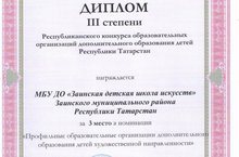 Поздравляем коллектив Детской школы искусств, занявших 3 место в Республиканском конкурсе образовательных организаций дополнительного образования детей Республики Татарстан в номинации «Профильные образовательные организации дополнительного образования детей художественной направленности». Молодцы! Желаем дальнейших успехов.