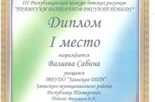Поздравляем Валиеву Сабину, занявшую 1 место в III Республиканском конкурсе рисунков «Правнуки ветеранов рисуют победу» (педагог Васильева В.Н.).