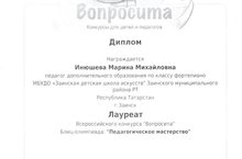 Поздравляем Инюшеву М.М., педагога отделения музыкального искусства, лауреата Всероссийского конкурса «Вопросита» в Блиц-олимпиаде «Педагогическое мастерство».