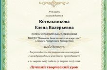 Поздравляем Котельникову Елену Валерьевну, педагога отделения музыкального искусства, ставшую Победителем Всероссийского дистанционного конкурса с международным участием в номинации «Лучший творческий урок».