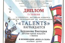 Поздравляем Берданову Викторию, занявшую 1 место в VI открытом Республиканском фестивале-конкурсе вокалистов-исполнителей на иностранном языке «TALENTS» (педагог Инюшева М.М.).