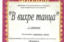 Поздравляем Образцовый детский хореографический коллектив «Каприз» и руководителя Маркелову Розу Альбертовну занявших 1 место в открытом Республиканском конкурсе хореографических коллективов «В вихре танца». Молодцы! Желаем дальнейших успехов!