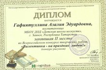 Поздравляем Гафиятуллину Азалию, обучающуюся 5 класса отделения изобразительного искусства, занявшую 2 место во Всероссийском конкурсе творческих работ «Валентинка – на праздник любви!» (педагог Степанова А.Н).