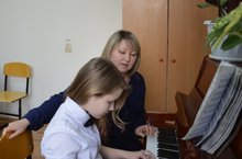 Педагог Инюшева М.М. и обучающаяся 4 класса Берданова Виктория на уроке по специальности «Фортепиано».