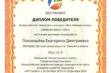 Поздравляем Понамарёву Екатерину, обучающуюся 4 класса отделения изобразительного искусства, занявшую 2 место во Всероссийском конкурсе творческих работ «Моя любимая сказка» (педагог Степанова А.Н). Молодец! Желаем дальнейших успехов!