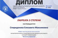 1.Инюшева М.М. – Сертификат куратора, 2.Спиридонова Елизавета – Диплом Лауреата 3 степени.