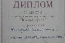 Поздравляем Дмитриева С.И., педагога отделения изобразительного искусства, занявшего 2 место в городском конкурсе-выставке «В мире кукол».
