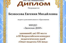 Поздравляем Безносову Е.М., педагога отделения музыкального искусства, занявшую 3 место в III Всероссийском конкурсе педагогических идей «Опыт педагога XXI века».