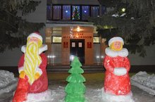 Коллектив школы искусств украсил свою территорию ледяными скульптурами Деда Мороза , Снегурочки и пушистой елочки.