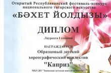 26 ноября Образцовый детский хореографический коллектив «Каприз» участвовал в Открытом Республиканском фестивале-конкурсе национального татарского искусства "Бэхет йолдызы". Награждены дипломом Лауреата 1 степени (2 младшая группа 7-10 лет) и дипломом 1 степени (средняя группа 11-13 лет) ПДО Маркелова Р.А.. Поздравляем!
