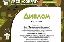 Поздравляем Хор «Музыкальная фантазия», ставшего Победителем (1 место ) в VI Всероссийском конкурсе для детей и молодежи «Неограниченные возможности» (ПДО Безносова Т.Е.).