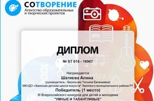 Поздравляем Шагиеву Алину, ставшую Победителем (1 место ) в ІІІ Всероссийском конкурсе для детей и молодежи «Умные и талантливые» (ПДО Безносова Т.Е.).