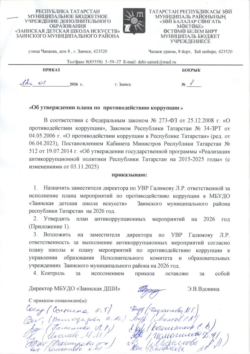 Приказ №1 от 12.01.2026г. «Об утверждении плана по противодействию коррупции».