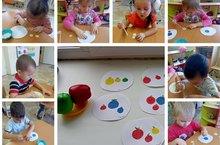 Аппликация во 2 мл группе на тему: "Большие и маленькие яблоки на тарелке". Цель: учить детей наклеивать круглые предметы. Закреплять представления о различии предметов во величине и т.д.