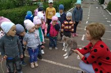 В течение всего учебного года воспитатели знакомят детей с домашними и дикими животными. Летняя пора это время наблюдений не только за красотой природы, но и животным миром. Сегодня у нас в гостях была маленькая кошечка, дети с удовольствием рассматривали ее, подражали, как мурлычет, показывали, как она умывается. Наглядные методы помогают детям получать новые знания.