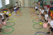 Упражнения с мячом - один из самых любимых видов деятельности детей на занятиях по физической культуре. И это неспроста, ведь выполняя разнообразные действия с мячом, ребята получают нагрузку на все группы мышц (туловища, брюшного пресса, ног, рук, кистей), у них активизируется весь организм. "Игры с мячом - специальная комплексная гимнастика: развивается умение схватывать, удерживать, перемещать мяч в процессе ходьбы, бега или в прыжке" - считает инструктор по физической культуре Герасимова О.Н. и часто использует мяч в работе с дошкольниками. "Мяч не теряй - вверх поднимай", "Лови - бросай, упасть не давай", "Стукни - поймай, уйти не давай" - любимые игры младших дошкольников, старшие ребята любят упражнения с элементами соревнования, спортивных игр, требующие ловкости и сноровки.