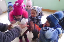 Сегодня малыши первой младшей группы вместе с воспитателем Ковальчук И.А. наблюдали на прогулке за падающими снежинками. Снежинки медленно кружились и тихо падали на дорожку, на ступеньки и на крыши домов. Малыши с восторгом наблюдали за природным явлением. С радостью брали в руки снег. А в конце прогулки воспитатель слепила «Колобка», которого поставили перед окнами группы. Теперь ребята будут смотреть из окна на сказочного героя, и ждать прихода Зимы.