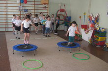 Сегодня среди старших дошкольников инструктор по физической культуре Герасимова О. Н. провела тренировку юных космонавтов. Ребятам были предложены задания, развивающие ловкость, быстроту, координацию, чувство ориентации в пространстве. Самым интересным и захватывающим заданием было - прыжки на батуте с точным приземлением в обруч. Со всеми заданиями юные космонавты справились, за что в конце занятия получили жетон: «Будущему космонавту».