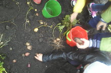Вот и наступила осень… «Ура! На картошку!»- слышны голоса ребят из подготовительной группы. Они сегодня собираются копать картошку, выращенную на своем огороде. На прогулке ребята с удовольствием приступили к трудовой деятельности и вместе с воспитателем начали копать. Картошка уродилась на славу! Как рады ребята, когда увидали результаты своего труда. Все лето они ухаживали за посадками. Ведро картошки – это хороший урожай для нашего огорода сказала воспитатель, и предложила ребятам подумать, какие блюда из картофеля они знают. В конце прогулки отнесли урожай на кухню, чтобы всех угостить. А в беседе рассказали о своих любимых блюдах из этого чудо - овоща.