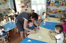 Менә шулай 1 кечкенәләр төркеме балалары күмәкләшеп кошлар туендыралар.