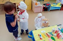 В первой младшей группе прошла беседа о людях в белых халатах с просмотром презентаций и мультфильмов. Рассматривали плакаты и картинки «Окажи первую помощь», «Если малыш поранился». Свои знания дети применили в сюжетно-ролевых играх «На приёме у Доктора Айболита», «Мы не скажем, мы покажем». Итогом беседы стала викторина между командами «Аскорбинки» и «Витаминки». Команды получили витаминные призы.
