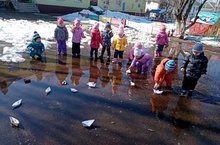 Григорьева В.Б. вместе с детьми 1 младшей группы рассмотрели кораблики, сделанные совместно с родителями и уточнили их размеры (большой, маленький), где плавают кораблики (в воде по морю, по реке). Воспитатель предложила детям пустить кораблики по ручейку. Весело зажурчал ручей и дети пустили свои кораблики по воде. Интересно играли в подвижную игру «Солнышко и дождик».