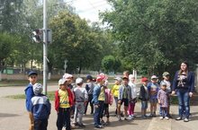 5 июля дети средней и старшей групп совместно с воспитателем Агзамовой Г.Х. ходили на экскурсию к перекрёстку. Воспитатель познакомила детей с перекрестком и правилами поведения на этом участке дороги. Также дети расширили свои знания об улице. Воспитатель напомнила детям о том, как надо переходить дорогу (на зеленый цвет светофора и через пешеходный переход, держась за руку). Детям экскурсия очень понравилась.