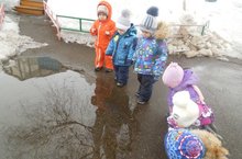 Сегодня 19 марта на прогулке дети наблюдали за лужами. Воспитатель рассказала о первых признаках весны: тает снег, образуются лужи, бегут ручьи. Дети заметили изменения, происходящие в природе, внимательно слушали приметы о весне, с интересом рассматривали облака, деревья, которые отражаются в воде. Воспитатель объяснила, что предметы отражаются только в спокойной воде.