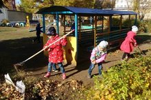 Балаларны кечкенәдән эш сөяргә,эш серләренә төшенергә өйрәтәбез. Кизү торабыз, үзебезнең уен мәйданчыгын тәртипкә китерәбез.15 октябрь иртәсендә, мәктәпкә әзерлек төркеме балалары үзләренен уен мәйданчыгын көзге яфраклардан чистарттылар.Үзләренә тапшырылган эшне зур җаваплылык белән башкардылар. Бик канәгать калдылар.