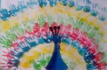 На последнем занятии кружка «Юный художник» воспитатель Тугашева Г.Х с воспитанниками 2-ой младшей группы провела коллективную работу на тему «Сказочный павлин». Дети закрепили умения использовать технику печатания ладошками различных цветов для хвоста павлина. Воспитанники получили большое наслаждение и восторг от рисования.