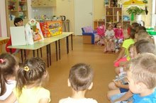 15 июля 2015 года погода выдалась пасмурная и дождливая, но это не помешало воспитателю Шаяхметовой М.М. развлечь детей. Воспитатель показала детям постановку - кукольный театр «Лисичка сестричка и серый волк». Данный кукольный театр был подарен воспитанникам детского сада руководителем Исполнительного комитета Заинского муниципального района Каримовым Р. Г. на «День защиты детей». Театр очень яркий и современный. Сказку дети слушали заинтересованно, не отвлекаясь. Театр позволяет воспитывать детское творчество, усидчивость, развивает воображение, пассивный словарь детей.