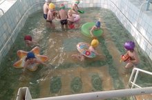 Инструктор по физическому воспитанию детей, прводит новую игру в бассейне - "Мячик в домике". Краткое соержание игры: члены команды, перебрасывая друг другу мяч, должны коснуться им "домика" противника. Побеждает та команда, которая успела больше всего раз коснуться мячом чужого домика.