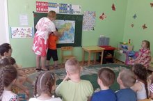 Воспитатель подготовительной к школе группы "Лягушонок" Торопова О.А. познакомила детей с картой мира. Дети научились различать и называть материки, океаны, полюса.