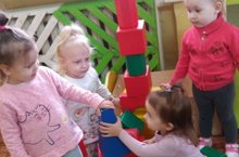 Дети первой младшей группы "А" очень любят сооружать постройки из крупного строительного материала. С помощью таких игр у наших малышей развивается пространственное мышление, логика и координация движений, а мелкая моторика, задействованная при игре с кубиками, помогает развивать речь и фантазию. Дети строят множество разнообразных вещей, но больше всего им нравиться строить дома, замки и башни. -