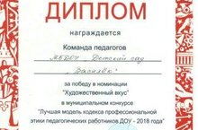 Сегодня в МБДОУ «Волшебная сказка» состоялся муниципальный конкурс «Лучшая модель кодекса профессиональной этики педагогических работников ДОУ – 2018». Команда нашего детского сада в составе пяти человек стала победителем в номинации «Художественный вкус».