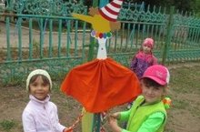 На участке группы “Дюймовочка» поселился сказочный персонаж «Буратино», который стал учить мальчиков и девочек плести косички и завязывать бантики.