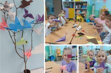 В старшей логопедической группе "Жемчужинки" дети в творческой деятельности создавали шедевры. Под чутким руководством воспитателя, сделали птичек в технике оригами. Им было очень интересно увидеть, как лист бумаги, согнутый ими определённым способом, вдруг превращается в шедевр.