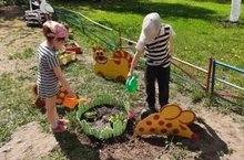 Воспитатель Баринова Н.А. совместно с детьми старшей логопедической группы "Классики" высадили на участке цветы в яркие, не обычные клумбы.