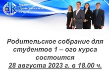 Родительское собрание для студентов 1 – ого курса состоится 28 августа 2023 г. в 18.00 ч. 24.08.2023