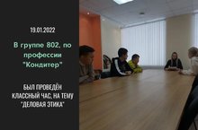 19.01.2022 г. в группе 802 по профессии "Кондитер" состоялся классный час на тему "Деловая этика"