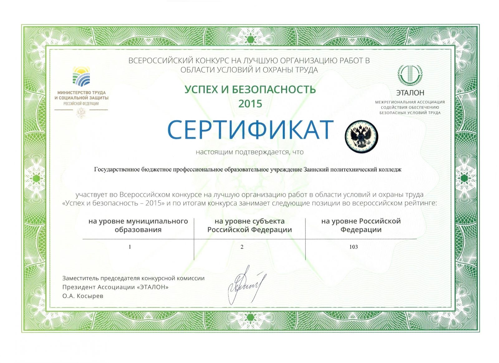 Опубликовано: 28.12.20161 августа 2014 года Министерство труда и социальной защиты РФ дало старт Всероссийскому конкурсу на лучшую организацию работ в области условий и охраны труда «Успех и безопасность». Задачами проведения конкурса являются создание безопасных и здоровых условий труда на рабочих местах, пропаганда вопросов охраны труда, снижение и профилактика несчастных случаев на производстве и профессиональных заболеваний, изучение и распространение передового опыта по внедрению системы управления охраной труда, повышение квалификации специалистов по охране труда. Всероссийский конкурс проводится ежегодно. По результатам конкурса формируются и утверждаются рейтинги организаций, характеризующие уровень производственного травматизма, условий труда и организации работ в области условий и охраны труда, соответствие квалификации специалистов по охране труда организации установленным требованиям. Наш колледж уже второй раз принимает участие в этом конкурсе, о чем и свидетельствует этот сертификат. Сейчас идет подготовительная работа к Всероссийскому конкурсу «Успех и безопасность - 2016»