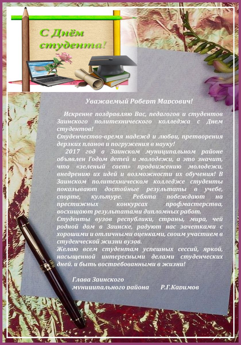 Опубликовано: 25.01.2017В адрес директора колледжа, студенческого и педагогического коллективов поступила поздравительная телеграмма от Главы Заинского муниципального района Разифа Галиевича Каримова. С днем студента!