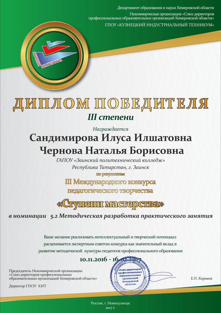 Опубликовано: 21.02.2017Преподаватели колледжа Сандимирова И.И. и Чернова Н.Б. стали призерами III Международного конкурса педагогического творчества “Ступени мастерства” в номинаөии “Методическая разработка практического занятия”, заняв III место за свою творческую работу.
