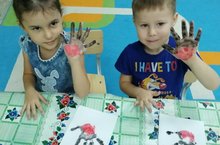 А для создания шедевра-снегиря, воспитанникам группы "Жемчужинки" понадобились ладоши, гуашь и кисти. -