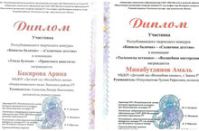 Редакция журнала «Тылсымлы куллар», ООО «Ихлас» Провела Республиканский творческий конкурс «Кояшлы балачак» – «Солнечное детство» среди дошкольных образовательных учреждений, начальных классов общеобразовательных учреждений с целью формирования интереса к национальной культуре татарского народа, расширения и укрепления творческих контактов между педагогической общественностью, родителями и детьми Республики Татарстан. Наши воспитанники Минабутдинов Амаль и Бакирова Арина стали участниками этого конкурса и получили диплом. Поздравляем!!!