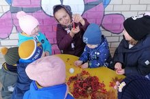 Осень золотая пора, на прогулке с детьми можно наблюдать много яркого и интересного. В осеннюю пору изобилие природного материала для поделок. После наблюдения за осенней рябиной, раскрашенной яркими красками, возникла идея изготовления бус из рябиновых ягод. Вот воспитанники группы Золотые зернышки соместно с воспитателем во время прогулки изготовили рябиновые бусы для своих любимых мамочек, дети с интересом наблюдали и помогали делать бусы. Возможность порадовать маму ярким подарком, сделанным своими руками, конечно, вызвала интерес у ребят. С работой справились.
