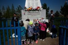 На память все граждане вместе сфотографировались у памятников участникам ВОВ.