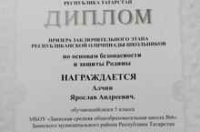 С 1 по 3 мая 2025 года на базе оздоровительно-образовательного комплекса «Дуслык» прошел заключительный этап этапа республиканской олимпиады школьников по основам безопасности и защиты Родины для учащихся 3-8 классов. По итогам участия в олимпиаде ученица 3 класса Маркосян Зарине и ученик 5 класса Алчин Ярослав стали призерами! Поздравляем призеров олимпиады и их наставников, учителя начальных классов Камалиеву Л.Ю., преподавателя – организатора основ безопасности и защиты Родины Ширяева А.И.!