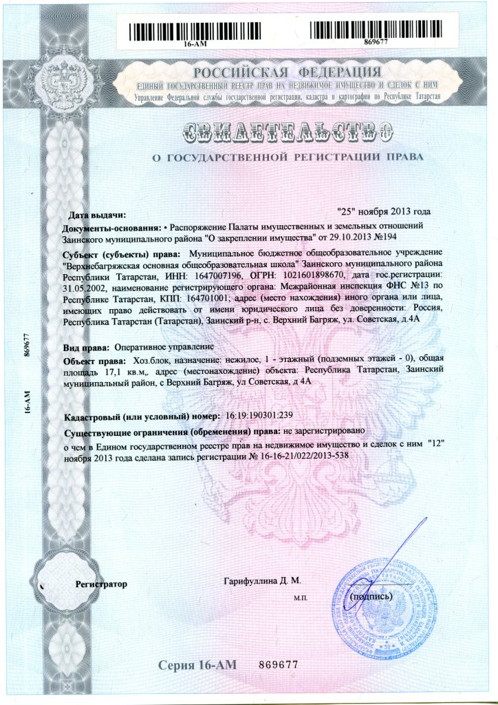 Свидетельство о государственной регистрации право. Объект: хоз.блок