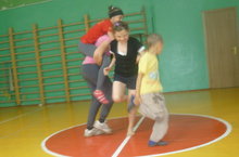 Кушачком подпоясался ты - богатырем назвался.Ходьба на четвереньках. Силу бедер нужно показать,